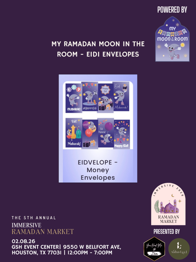 Salam and welcome to the 5th Annual Immersive Ramadan Market 2026. Last Ramadan was our fourth year to host the “Immersive Ramadan Market” with over 100+ Vendors; and this year we are back again InshAllah to highlight the best of Muslim Makers in the Houston and surrounding areas. Come join us on Sunday, January, 2026 – a day filled with an immersive market, where you can shop, welcome ramadan, and support muslim small businesses in Houston, Texas and beyond. Powered by My Ramadan Moon in the Room.