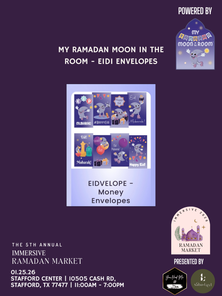 Salam and welcome to the 5th Annual Immersive Ramadan Market 2026. Last Ramadan was our fourth year to host the “Immersive Ramadan Market” with over 100+ Vendors; and this year we are back again InshAllah to highlight the best of Muslim Makers in the Houston and surrounding areas. Come join us on Sunday, January, 2026 – a day filled with an immersive market, where you can shop, welcome ramadan, and support muslim small businesses in Houston, Texas and beyond. Powered by My Ramadan Moon in the Room.